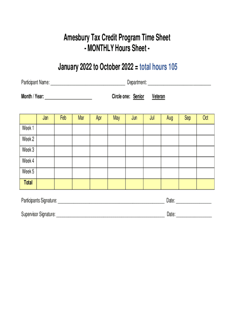 Amesbury Tax Credit Program Time Sheet MONTHLY Hours Sheet January 2022 to October 2022 total hours 105 Participant Names: Department: Month / Year: JanFebMarCircle one: SeniorAprMayJunVeteranJulAugSepOctWeek