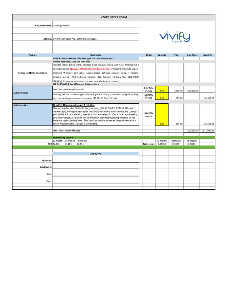 VIVIFY ORDER FORM Customer Name: Lionbridge HealthAddress: 2401 W. Belvedere Ave, Baltimore MD 21215ProductDescription Vivify Pathways +Home Fully Managed Kits (Purchase or Rent) Patient Hardware,