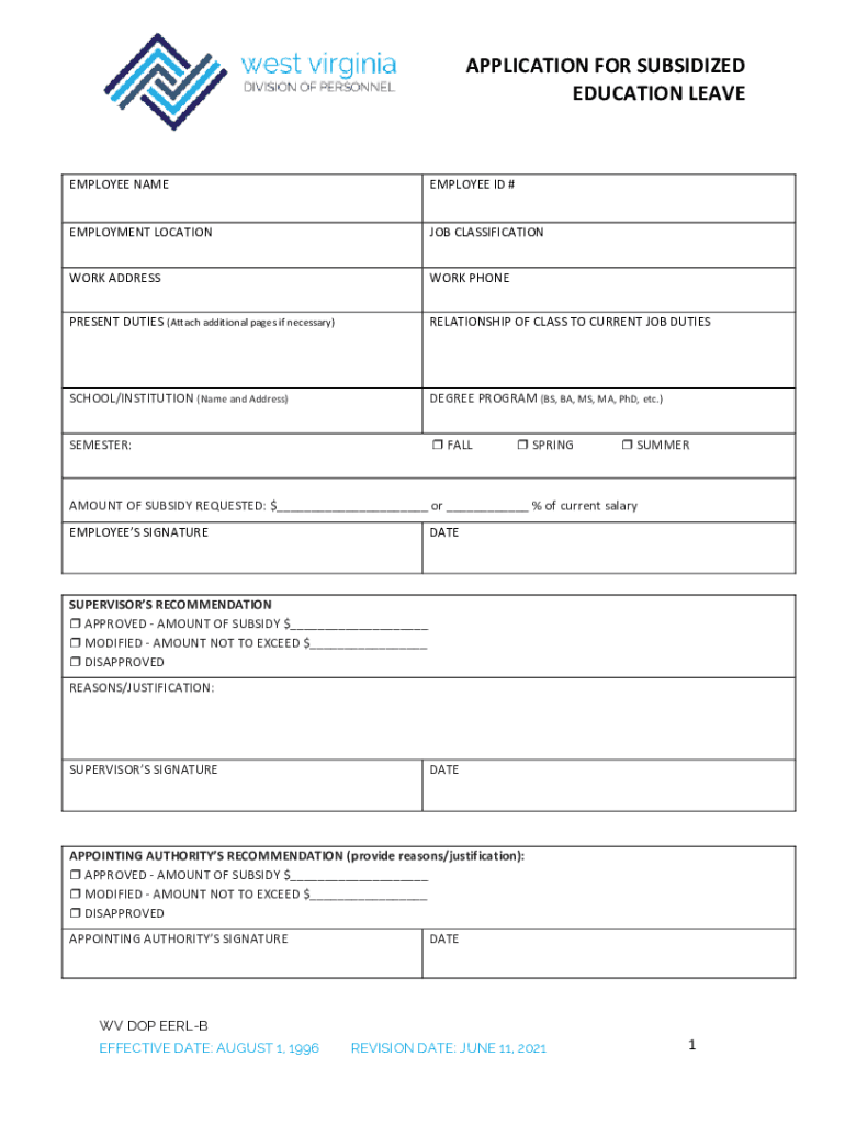 Get the free APPLICATION FOR SUBSIDIZED EDUCATION LEAVE - personnel wv