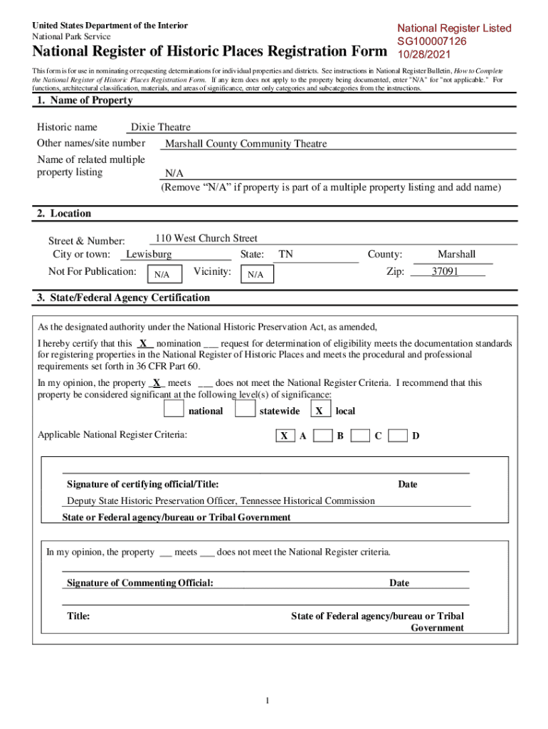 National Register Listed SG100007126 10/28/2021United States Department of the Interior National Park ServiceNational Register of Historic Places Registration Forms form is for use in nominating or