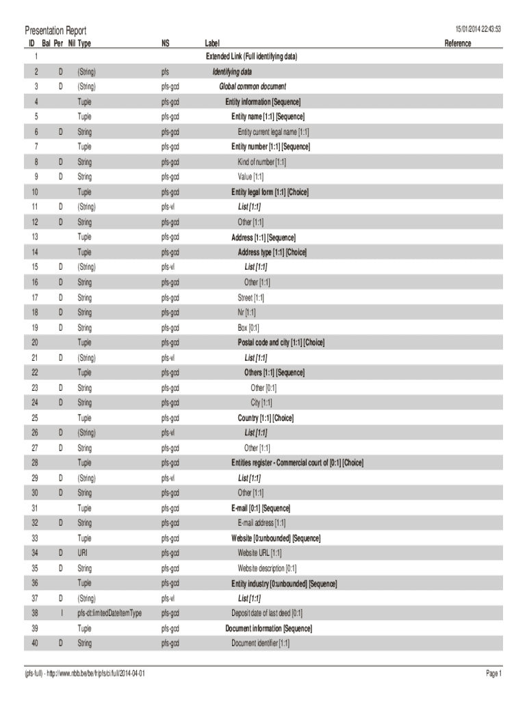 15/01/2014 22:43:53Presentation Report Ideal Per Nil TypeNS1 2D(String)pfs3D(String)pfsgcdTuplepfsgcd4 5 6D7pfsgcdEntity current legal name 1:1 TuplepfsgcdEntity number 1:1 Sequence pfsgcd9DStringpfsgcdTuplepfsgcd11D(String)pfsvl12DStringpfsgcdTuplepfsgcd14Entity