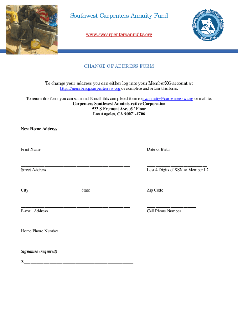 Southwest Carpenters Annuity Fund www.swcarpentersannuity.orgCHANGE OF ADDRESS FORM To change your address you can either log into your Member account at https://memberxg.carpenterssw.org or complete
