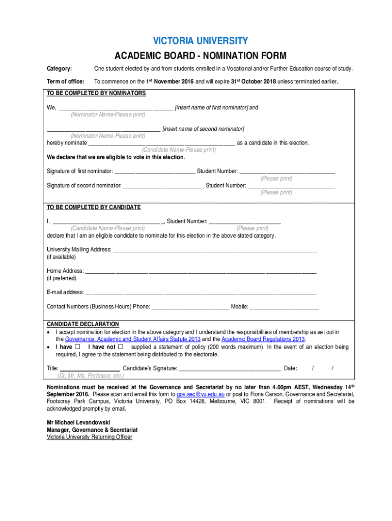 Get the free NOMINATION FORM - Victoria University Melbourne Australia