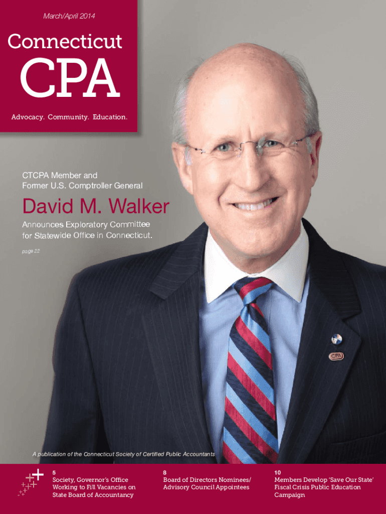 March/April 2014ConnecticutCPAAdvocacy. Community. Education.CT CPA Member and Former U.S. Comptroller General David M. Walker Announces Exploratory Committee for Statewide Office in Connecticut.
