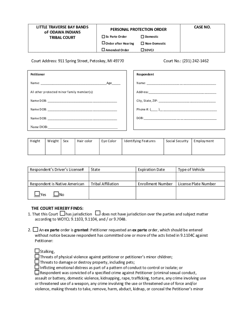 LITTLE TRAVERSE BAY BANDS of OD AWA INDIANS TRIBAL COURT CASE NO.PERSONAL PROTECTION ORDER Ex Parte OrderDomesticOrder after HearingNonDomesticAmended OrderSDVCJCourt Address: 911 Spring Street, Pentosan,