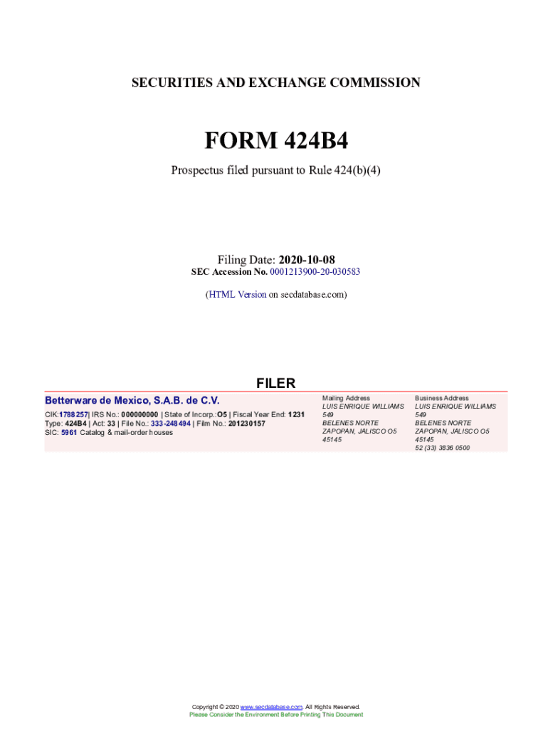 Get the free Betterware de Mexico, S.A.B. de C.V. Form 424B4 Filed 2020-10-08. Accession Number