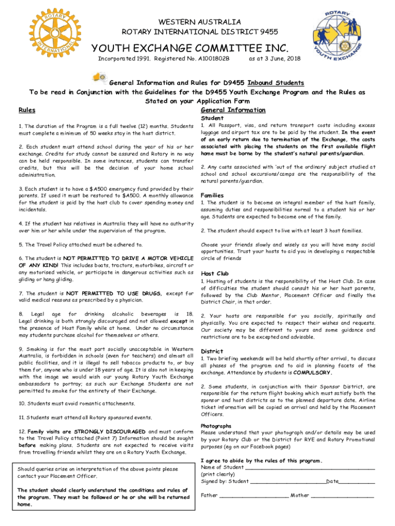 WESTERN AUSTRALIA ROTARY INTERNATIONAL DISTRICT 9455YOUTH EXCHANGE COMMITTEE INC. Incorporated 1991. Registered No. A1001802Bas at 3 June, 2018General Information and Rules for D9455 Inbound Students