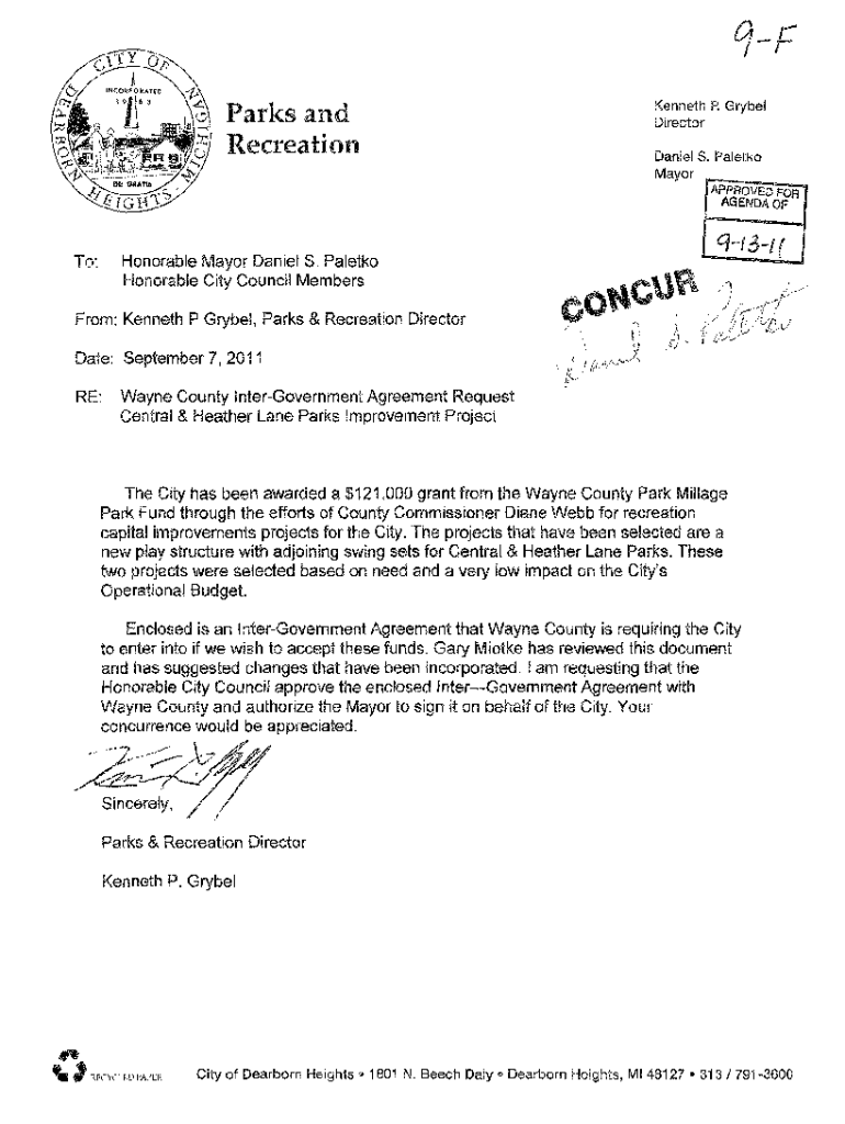 9F Parks and Recreation Kenneth P. Rebel Director Daniel S. Palermo Mayor APPROVED FOR AGENDA Onto:Honorable Mayor Daniels. Palermo Honorable City Council Membersq13! (From: Kenneth P Rebel, Parks