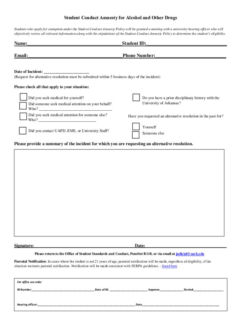 Division of Students AffairsStudent Conduct Amnesty for Alcohol and Other Drugs The University of Arkansas is committed to the safety and welfare of its students. It is critical for the safety of