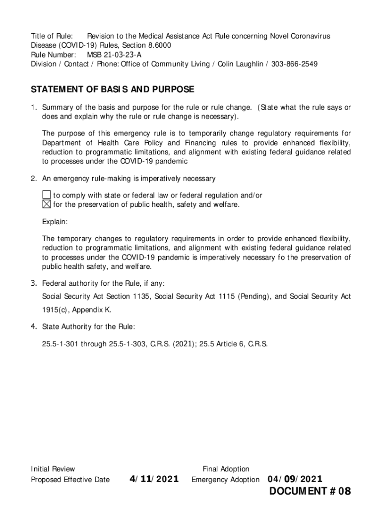 Title of Rule: Revision to the Medical Assistance Act Rule concerning Novel Coronavirus Disease (COVID-19) Rules, Section 8.6000 Rule Number: MSB 210323A Division / Contact / Phone: Office of Community