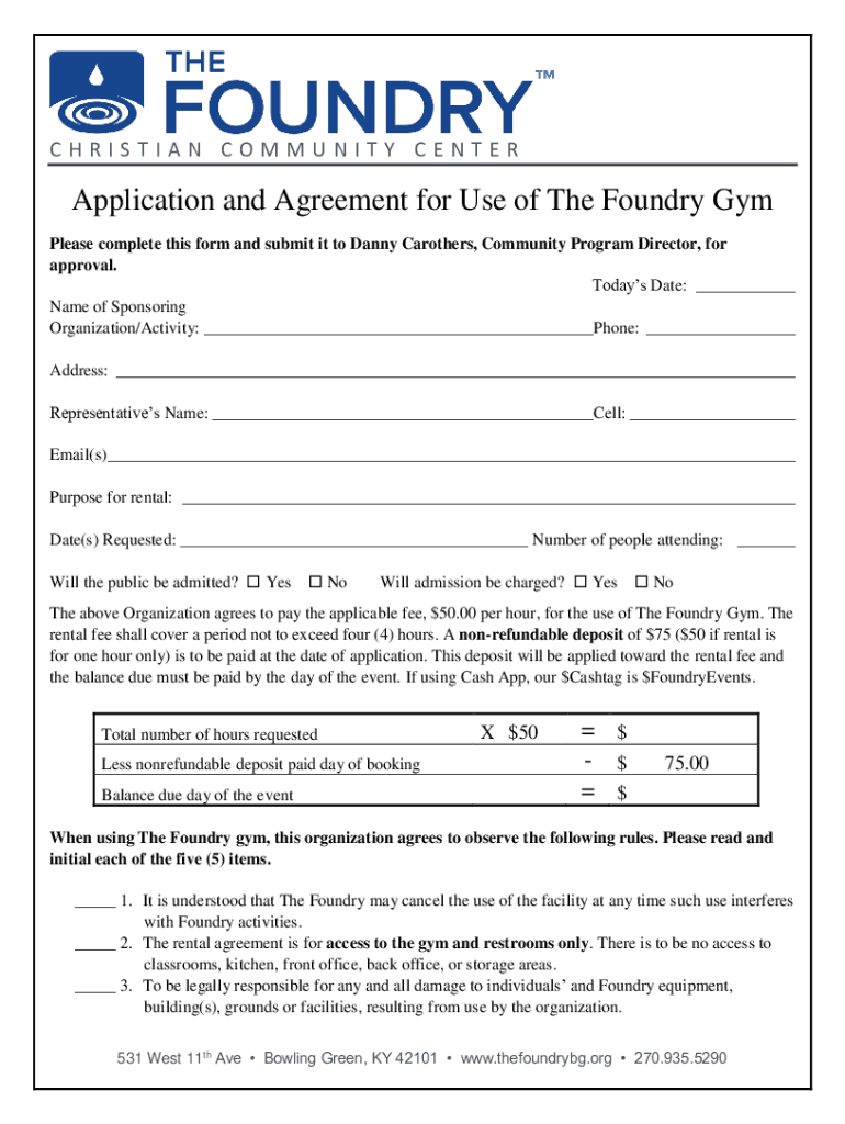 CHRISTIAN COMMUNITY CENTERApplication and Agreement for Use of The Foundry Gym Please complete this form and submit it to Danny Car others, Community Program Director, for approval. Today's Date:
