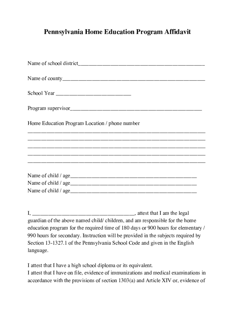 Pennsylvania Home Education Program AffidavitName of school district___ Name of county___ School Year ___ Program supervisor___ Home Education Program Location / phone number ___ ___ ___ ___ ___ Name