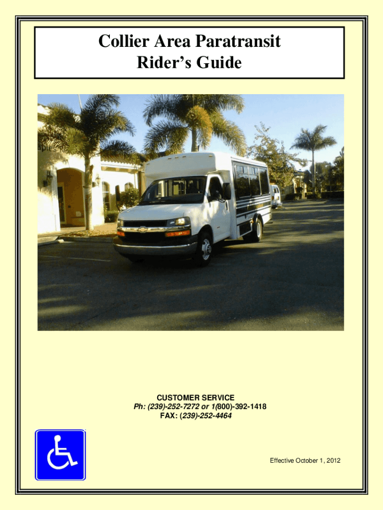 Collier Area Para transit Riders GuideCUSTOMER SERVICE pH: (239)2527272 or 1(800)3921418 FAX: (239)2524464Effective October 1, 2012Table of ContentsWelcome ..........................................................................