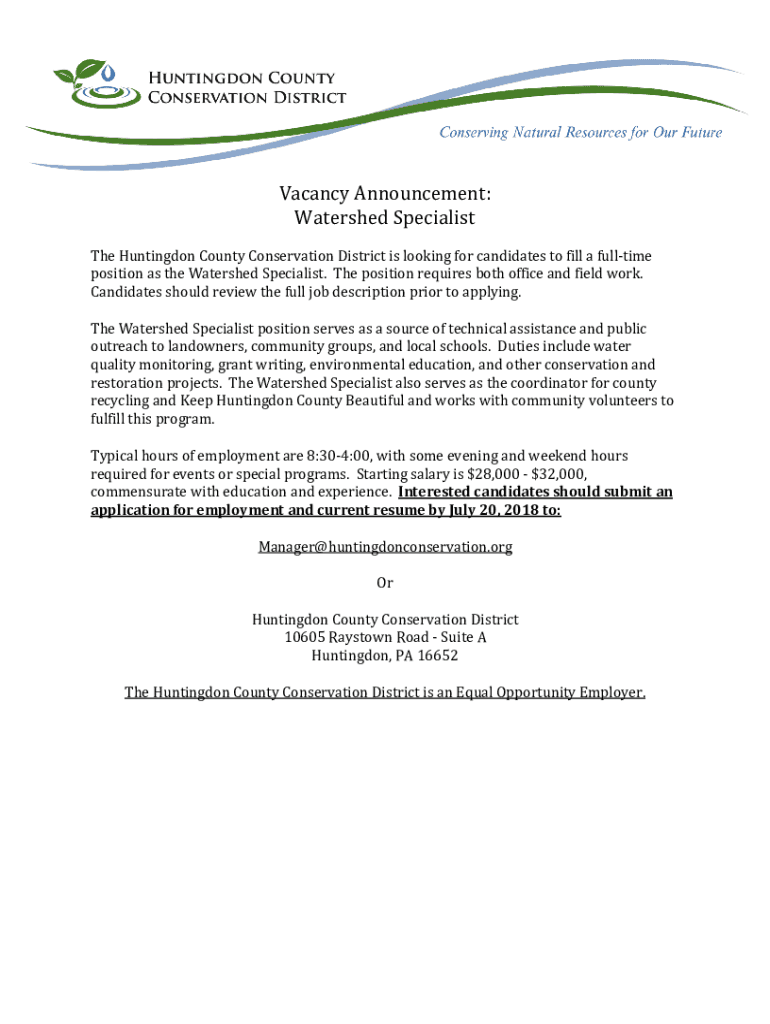 Vacancy Announcement: Watershed Specialist The Huntington County Conservation District is looking for candidates to fill a full time position as the Watershed Specialist. The position requires both