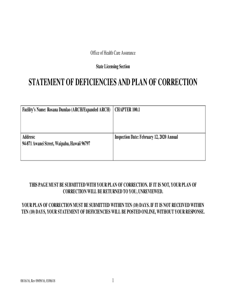 Office of Health Care Assurance State Licensing SectionSTATEMENT OF DEFICIENCIES AND PLAN OF CORRECTION Facilities Name: Rosana Dumas (ARCH/Expanded ARCH)CHAPTER 100.1Address: 94871 Adana Street,