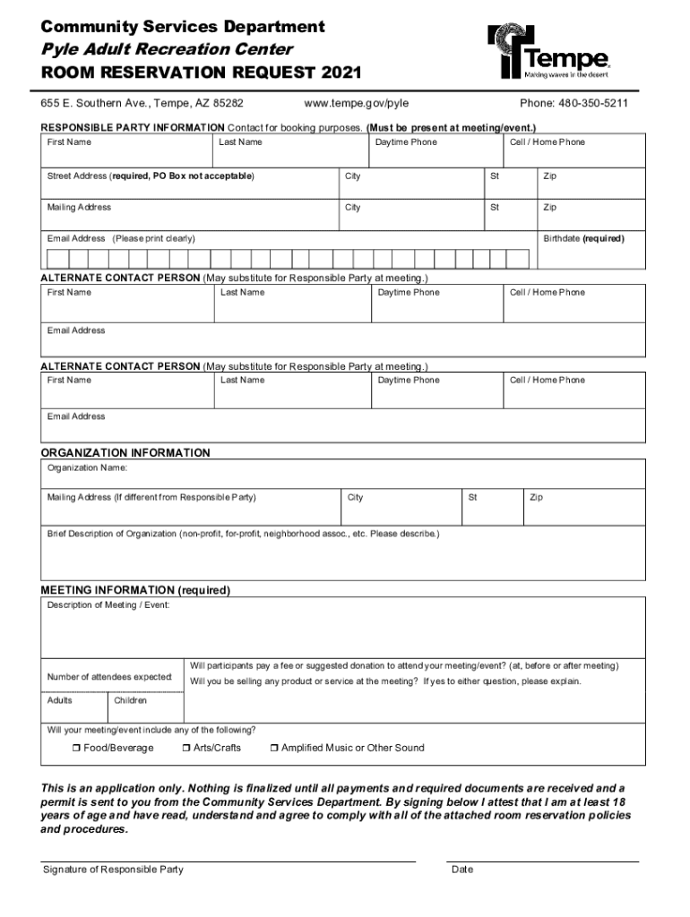 Community Services Department Pyle Adult Recreation Centerfold RESERVATION REQUEST 2021 655 E. Southern Ave., Tempe, AZ 85282www.tempe.gov/pylePhone: 4803505211RESPONSIBLE PARTY INFORMATION Contact