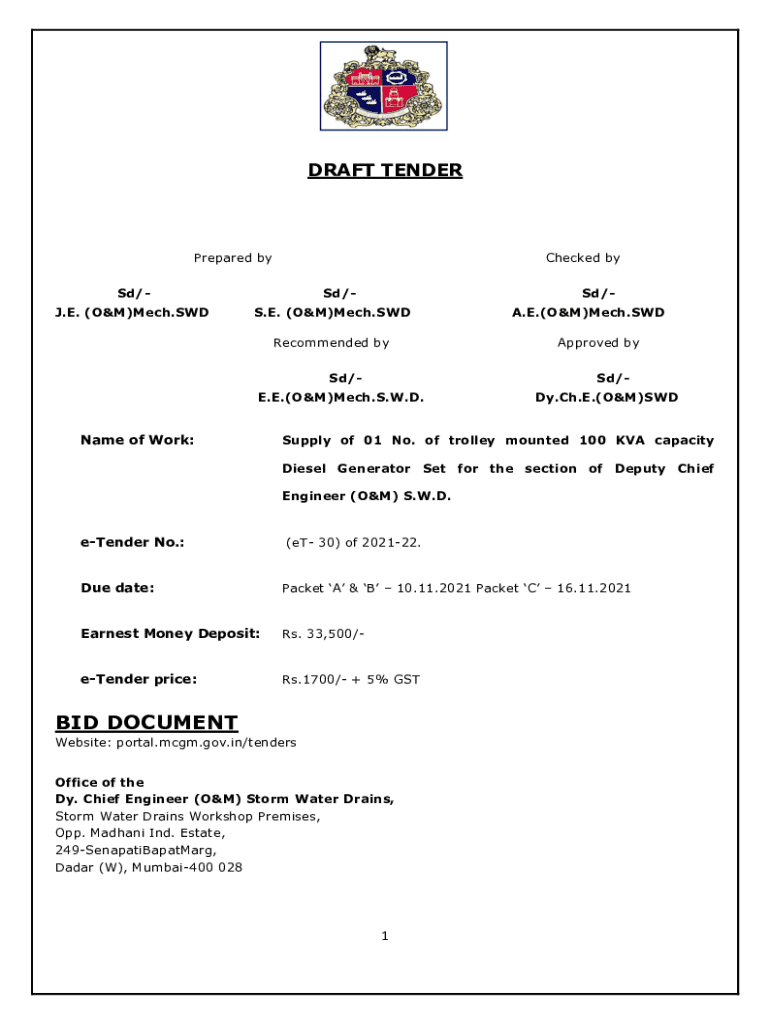 DRAFT TENDERPrepared checked BSD/J.E. (O&M)Mech.SWDSd/Sd/S.E. (O&M)Much.SD Recommended by SD/Approved by SD/E.E.(O&M)Much. S.W.D. Name of Work:A.E.(O&M)Much. Soddy. Ch. E.(O&M)Supply of 01 No. of