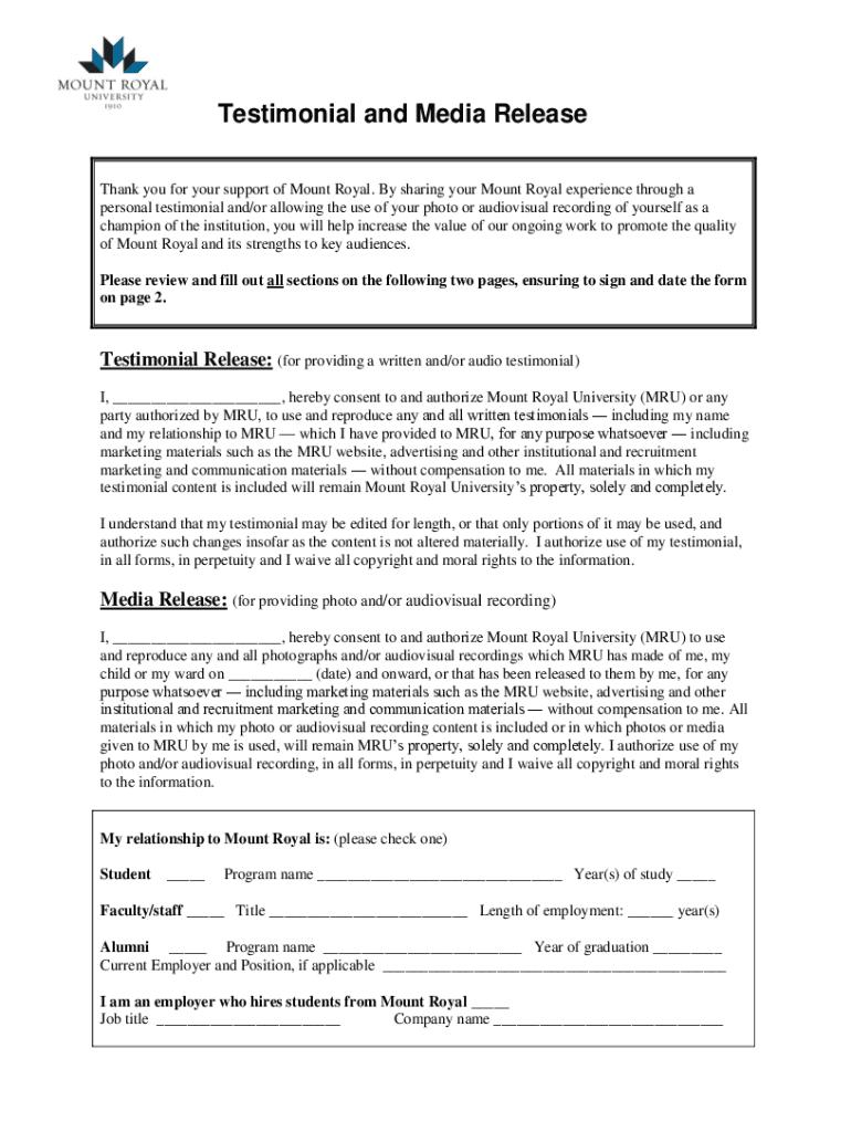 Testimonial and Media Release Thank you for your support of Mount Royal. By sharing your Mount Royal experience through a personal testimonial and/or allowing the use of your photo or audiovisual