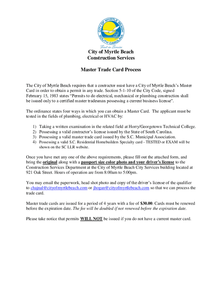 City of Myrtle Beach Construction Services Master Trade Card Processes The City of Myrtle Beach requires that a contractor must have a City of Myrtle Beach's Master Card in order to obtain a permit