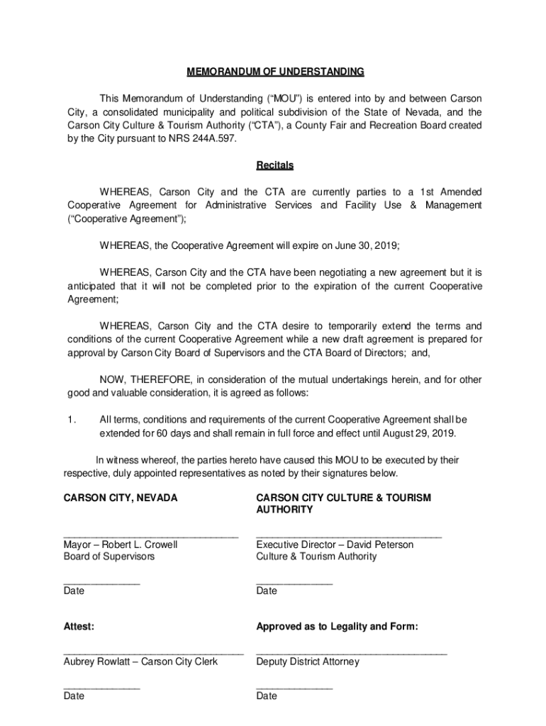 MEMORANDUM OF UNDERSTANDING This Memorandum of Understanding (YOU) is entered into by and between Carson City, a consolidated municipality and political subdivision of the State of Nevada, and the