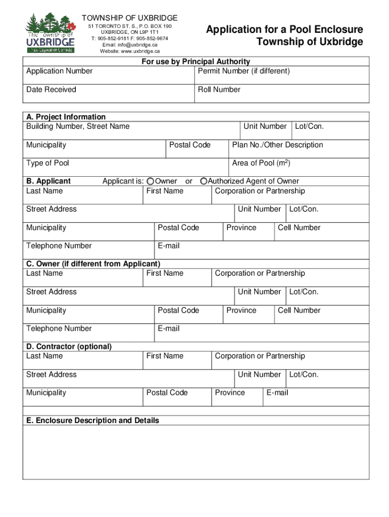 TOWNSHIP OF UXBRIDGE 51 TORONTO ST. S., P.O. BOX 190 UXBRIDGE, ON L9P 1T1 T: 9058529181 F: 9058529674 Email: info@uxbridge.ca Website: www.uxbridge.caApplication for a Pool Enclosure Township of Uxbridge