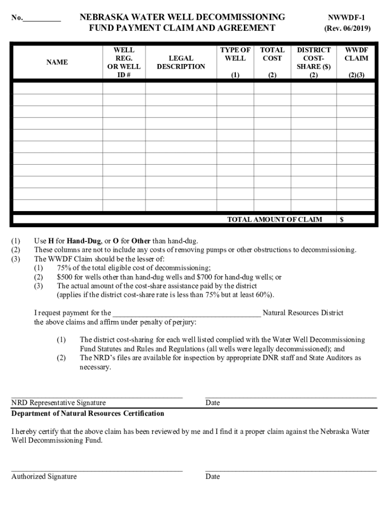 No.___NAMENEBRASKA WATER WELL DECOMMISSIONING FUND PAYMENT CLAIM AND AGREEMENT WELL REG. OR WELL ID #LEGAL DESCRIPTIONTYPE OF TEETOTAL COST(1)(2)NWWDF1 (Rev. 06/2019) DISTRICT COSTAR ($) (2)TOTAL