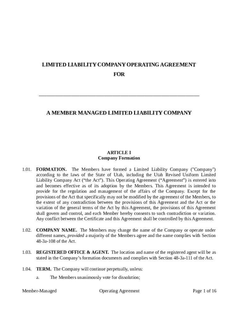 LIMITED LIABILITY COMPANY OPERATING AGREEMENT FOR ___ A MEMBER MANAGED LIMITED LIABILITY COMPANYARTICLE I Company Formation 1.01.FORMATION. The Members have formed a Limited Liability Company (\”