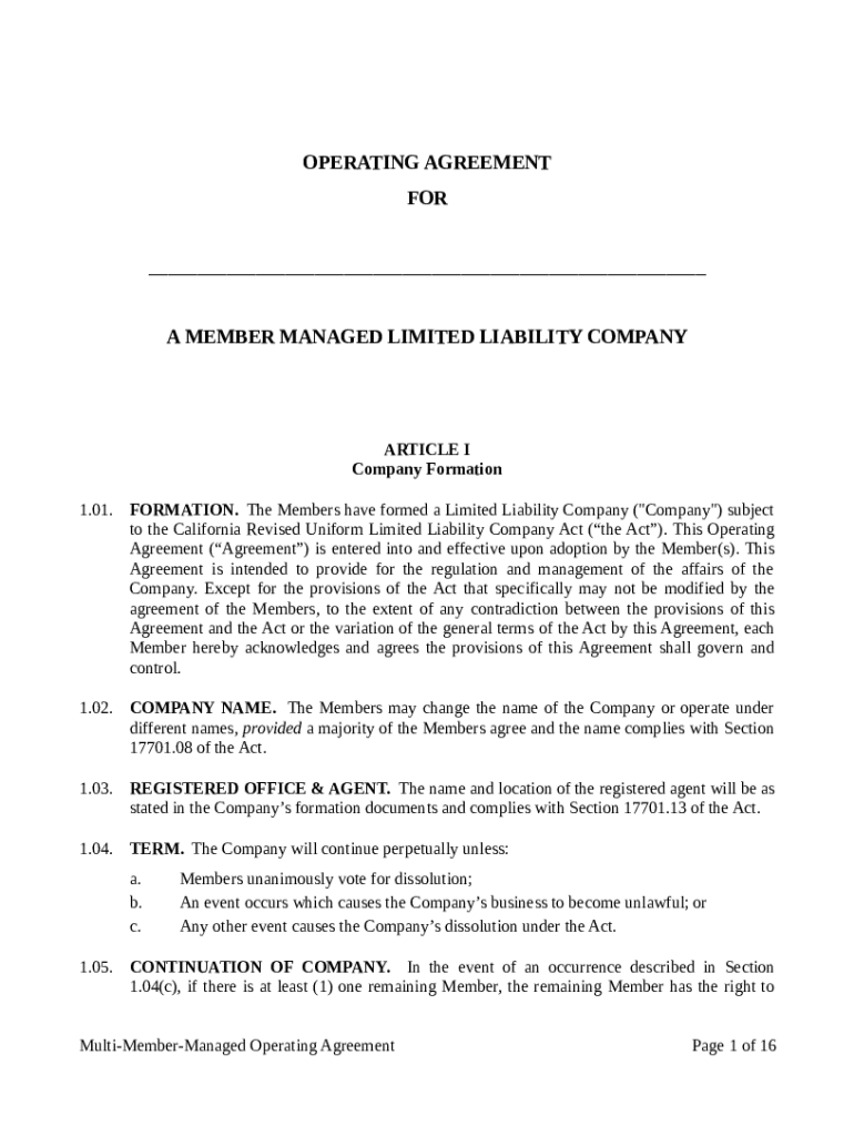 OPERATING AGREEMENT FOR ___ A MEMBER MANAGED LIMITED LIABILITY COMPANYARTICLE I Company Formation 1.01.FORMATION. The Members have formed a Limited Liability Company (\” Company\”) subject to