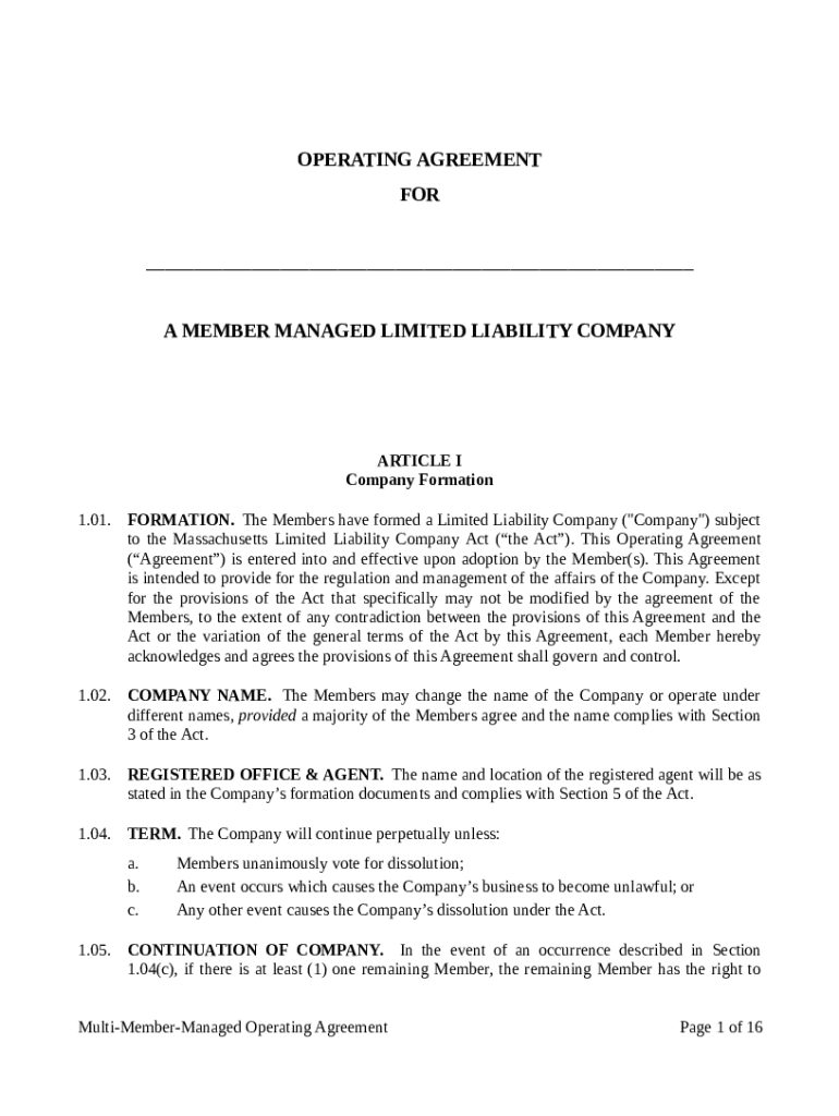 OPERATING AGREEMENT FOR ___ A MEMBER MANAGED LIMITED LIABILITY COMPANYARTICLE I Company Formation 1.01.FORMATION. The Members have formed a Limited Liability Company (\” Company\”) subject to