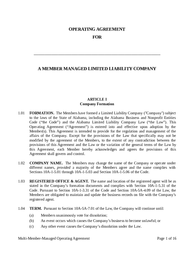 OPERATING AGREEMENT FOR ___ A MEMBER MANAGED LIMITED LIABILITY COMPANYARTICLE I Company Formation 1.01FORMATION. The Members have formed a Limited Liability Company (\” Company\”) subject to the