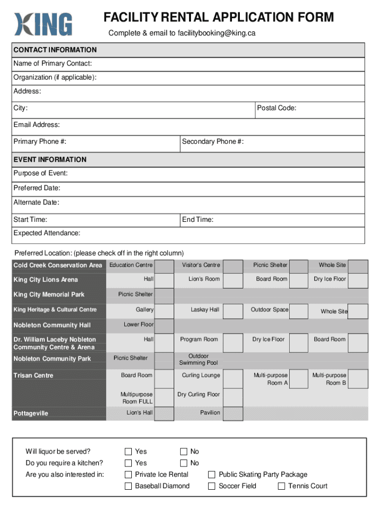 FACILITY RENTAL APPLICATION FORM Complete & email to facilitybooking@king.ca CONTACT INFORMATION Name of Primary Contact: Organization (if applicable): Address: City:Postal Code:Email Address: Primary