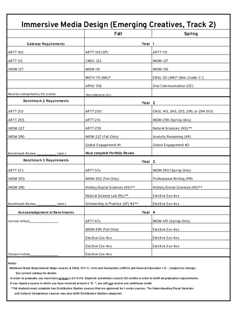 Immersive Media Design (Emerging Creatives, Track 2) Wellspring Year 1Gateway Requirements ART 100ARTT 100 (SP)ART 110ARTT 110CMSC 122IMDM 127IMDM 101IMDM 150MATH 115 (MA)*EGL 101 (AW)* Min. Grade: