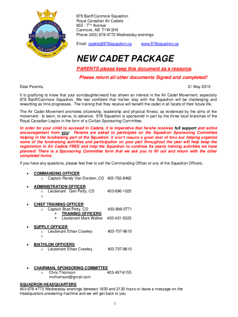 878 Ban ff/Can more Squadron Royal Canadian Air Cadets 602 7TH Avenue Can more, AB T1W 2H5 Phone (403) 6784772 Wednesday evenings Email: cadets@878squadron.cawww.878squadron.caNEW CADET PACKAGE PARENTS