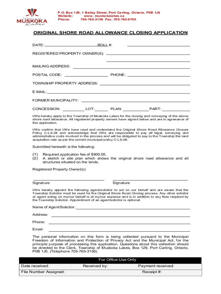 P.O. Box 129, 1 Bailey Street, Port Calling, Ontario, P0B 1J0 Website: WWW. Muskokalakes.ca Phone: 7057653156 Fax: 7057656755ORIGINAL SHORE ROAD ALLOWANCE CLOSING APPLICATION DATE:ROLL #:REGISTERED