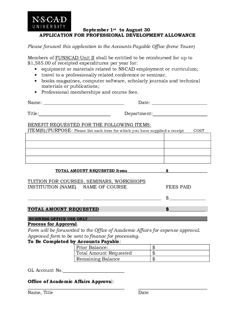 September 1st to August 30 APPLICATION FOR PROFESSIONAL DEVELOPMENT ALLOWANCE Please forward this application to the Accounts Payable Office (Irene Tower) Members of FUND Unit II shall be entitled