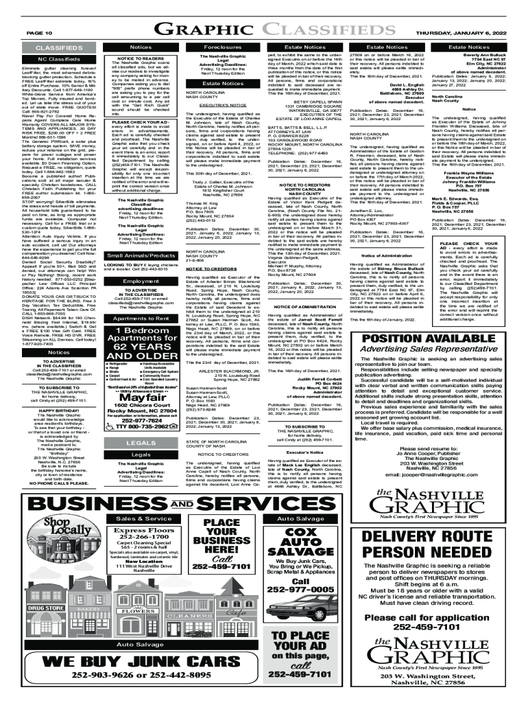 GRAPHIC CLASSIFIEDSPAGE 10ClassifiedsNoticesNC ClassifiedsNOTICE TO READERS The Nashville Graphic scans all classified ads, but we advise our readers to investigate any company asking for money to