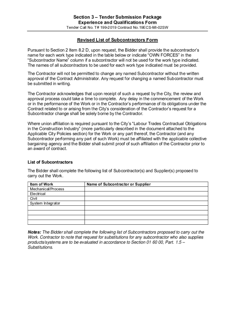 Section 3 Tender Submission Package Experience and Qualifications Form Tender Call No. T# 1992019 Contract No.19ECSMI02SWRevised List of Subcontractors Form Pursuant to Section 2 Item 8.2 D, upon