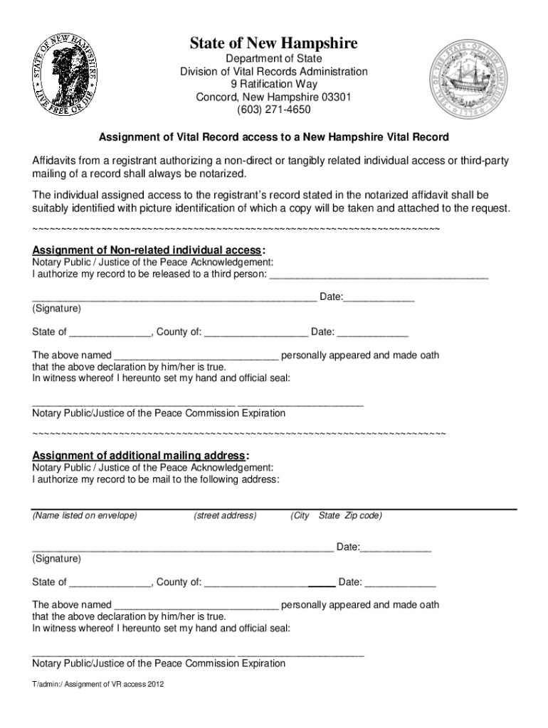 State of New Hampshire Department of State Division of Vital Records Administration 9 Ratification Way Concord, New Hampshire 03301 (603) 2714650 Assignment of Vital Record access to a New Hampshire