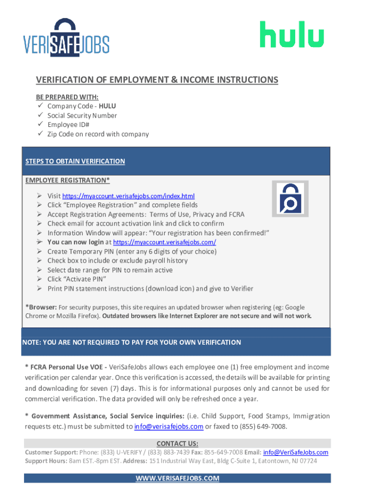 VERIFICATION OF EMPLOYMENT & INCOME INSTRUCTIONS BE PREPARED WITH: Company Code HULU Social Security Number Employee ID# Zip Code on record with companySTEPS TO OBTAIN VERIFICATION EMPLOYEE REGISTRATION*