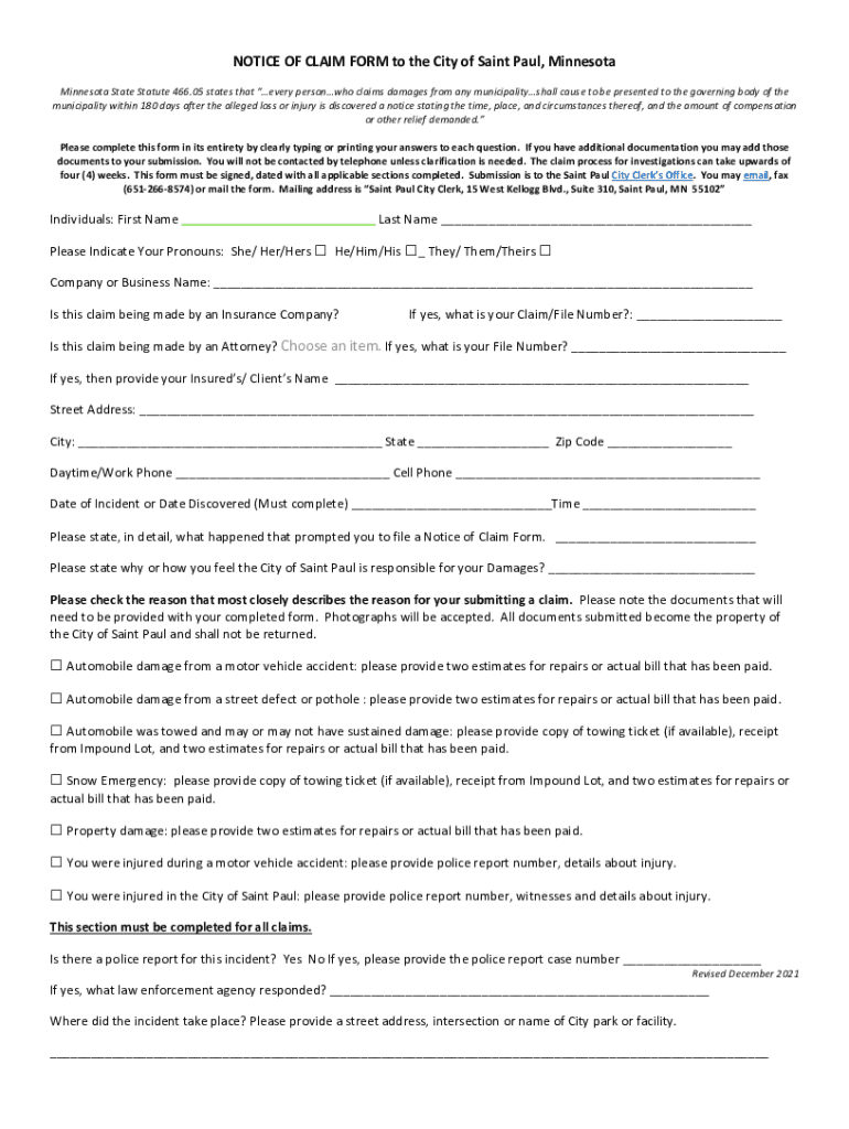 NOTICE OF CLAIM FORM to the City of Saint Paul, Minnesota State Statute 466.05 states that every person who claims damages from any municipality shall cause to be presented to the governing body of