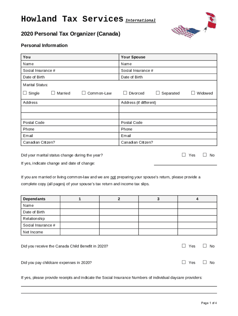Howland Tax Services International 2020 Personal Tax Organizer (Canada) Personal Information Your SpouseNameNameSocial Insurance #Social Insurance #Date of BirthDate of BirthMarital Status:SingleMarriedCommonLawDivorcedAddressAddress