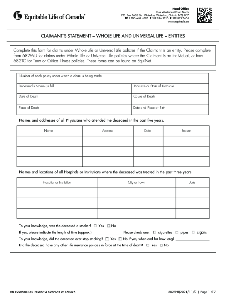 Head Office One West mount Road North P.O. Box 1603 STN. Waterloo, Waterloo, Ontario N2J 4C7 TF 1.800.668.4095 T 519.886.5210 F 519.883.7404 www.equitable.caCLAIMANTS STATEMENT WHOLE LIFE AND UNIVERSAL