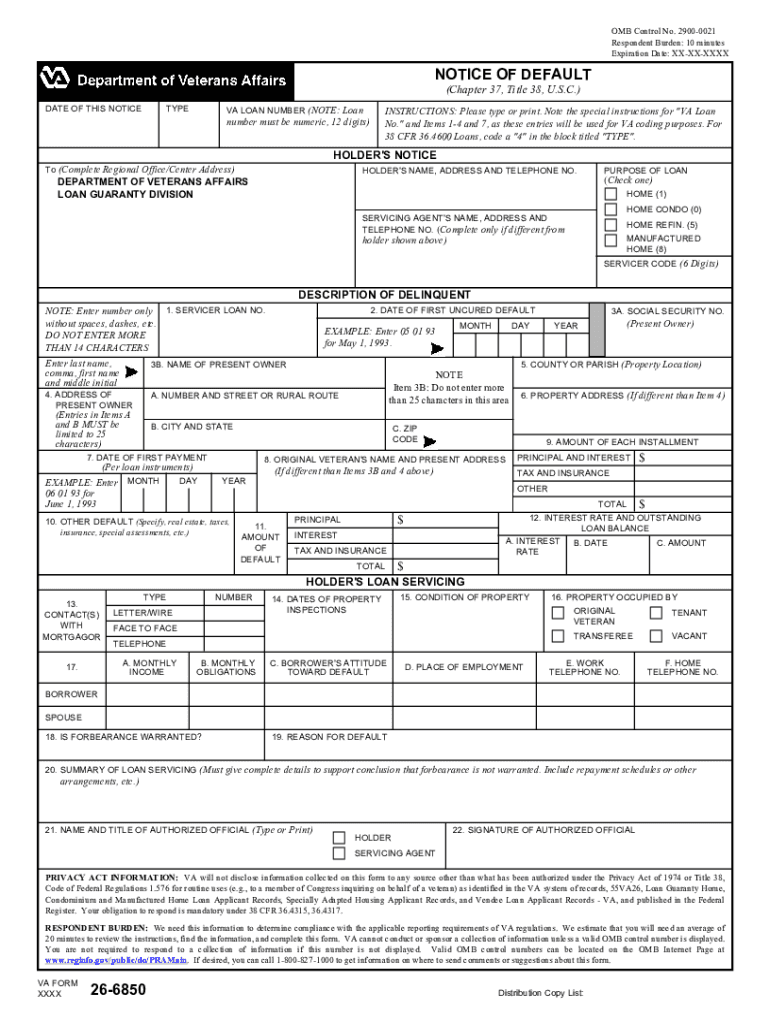 OMB Control No. 29000021 Respondent Burden: 10 minutes Expiration Date: XXXXXXXXNOTICE OF DEFAULT (Chapter 37, Title 38, U.S.C.)DATE OF THIS NOTICETYPEVA LOAN NUMBER (NOTE: LoanINSTRUCTIONS: Please
