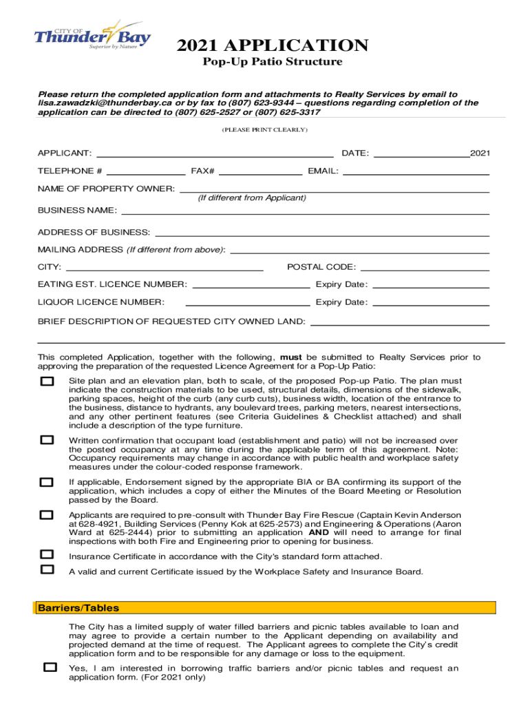 2021 APPLICATION Popup Patio Structure Please return the completed application form and attachments to Realty Services by email to lisa.zawadzki@thunderbay.ca or by fax to (807) 6239344 questions