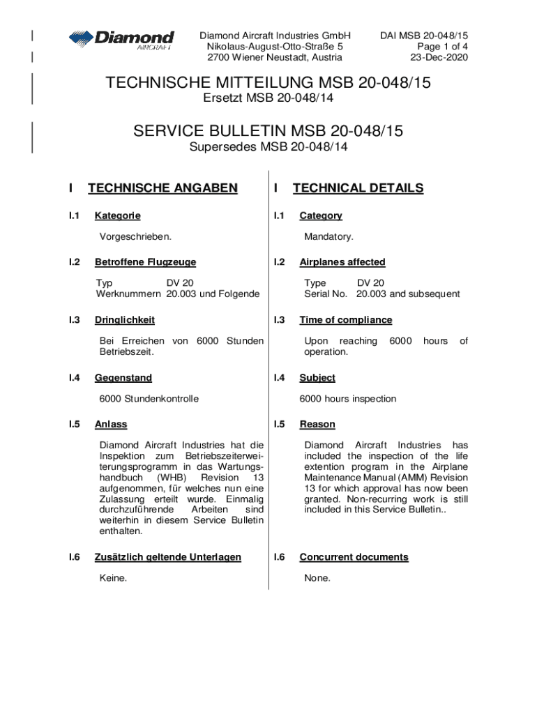 Diamond Aircraft Industries GmbH NikolausAugustOttoStrae 5 2700 Wiener Neustadt, Austria DAI MSB 20048/15-Page 1 of 4 23Dec2020TECHNISCHE MITTEILUNG MSB 20048/15 Ersatz MSB 20048/14SERVICE BULLETIN