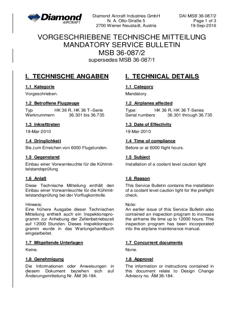 Diamond Aircraft Industries GmbH N. A. OttoStrae 5 2700 Wiener Neustadt, Austria DAI MSB 36087/2-Page 1 of 3 19Sep2016VORGESCHRIEBENE TECHNICAL MITTEILUNG MANDATORY SERVICE BULLETIN MSB 36087/2 supersedes