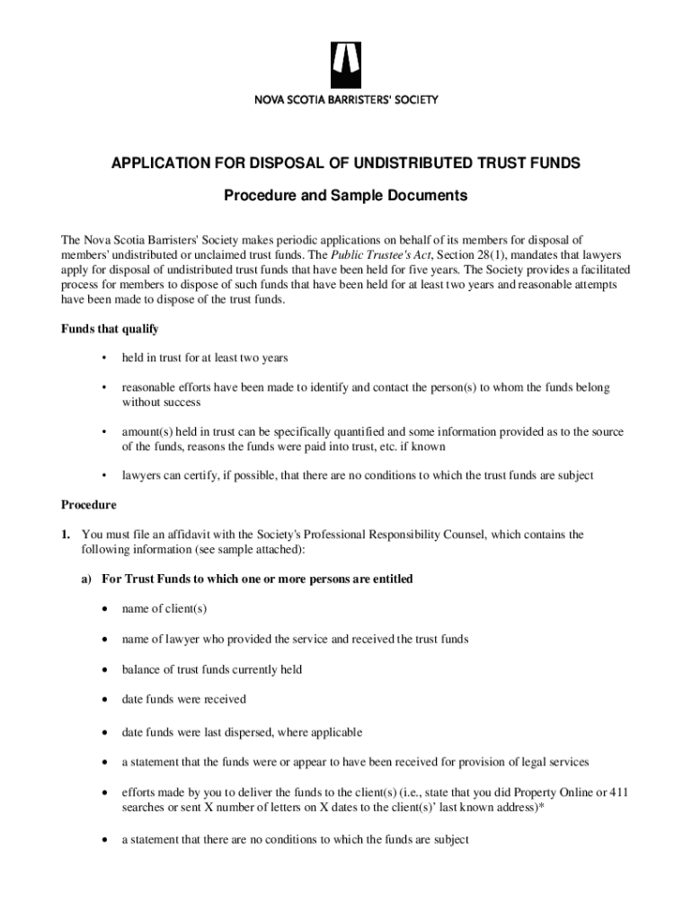 APPLICATION FOR DISPOSAL OF UNDISTRIBUTED TRUST FUNDS Procedure and Sample Documents The Nova Scotia Barristers\' Society makes periodic applications on behalf of its members for disposal of members\'