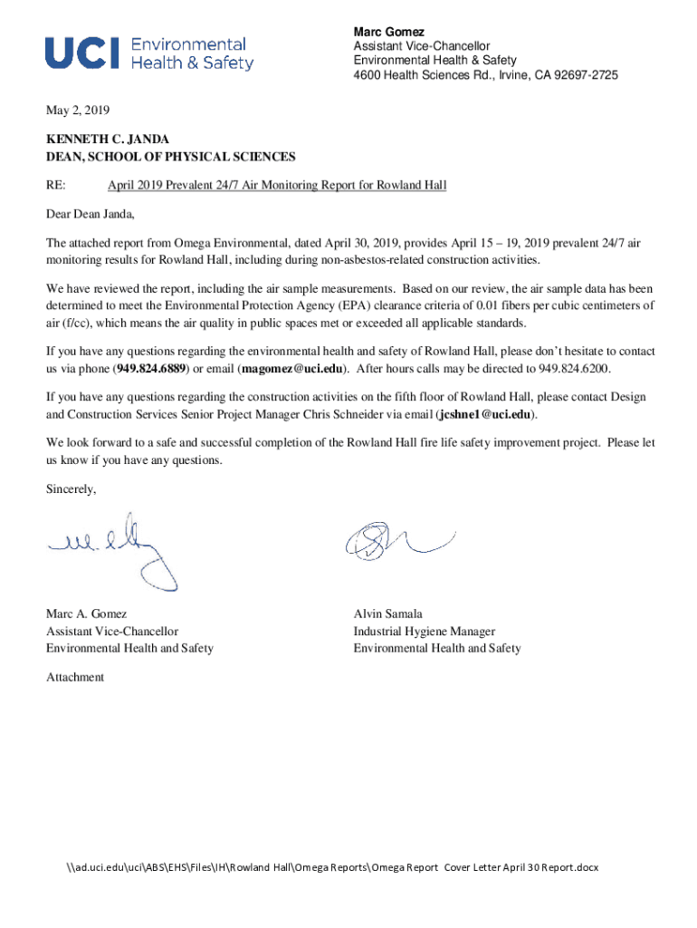 Marc Gomez Assistant ViceChancellor Environmental Health & Safety 4600 Health Sciences Rd., Irvine, CA 926972725May 2, 2019 KENNETH C. WANDA DEAN, SCHOOL OF PHYSICAL SCIENCES RE:April 2019 Prevalent