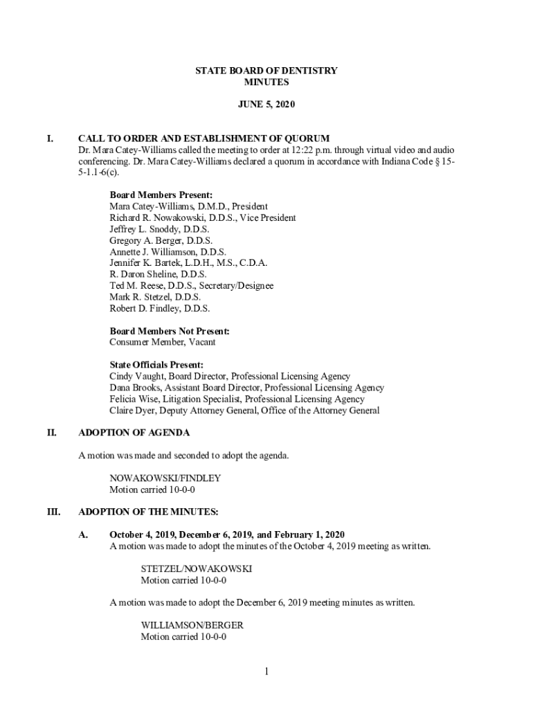 STATE BOARD OF DENTISTRY MINUTES JUNE 5, 2020, I.CALL TO ORDER AND ESTABLISHMENT OF QUORUM Dr. Mara CateyWilliams called the meeting to order at 12:22 p.m. through virtual video and audio conferencing.