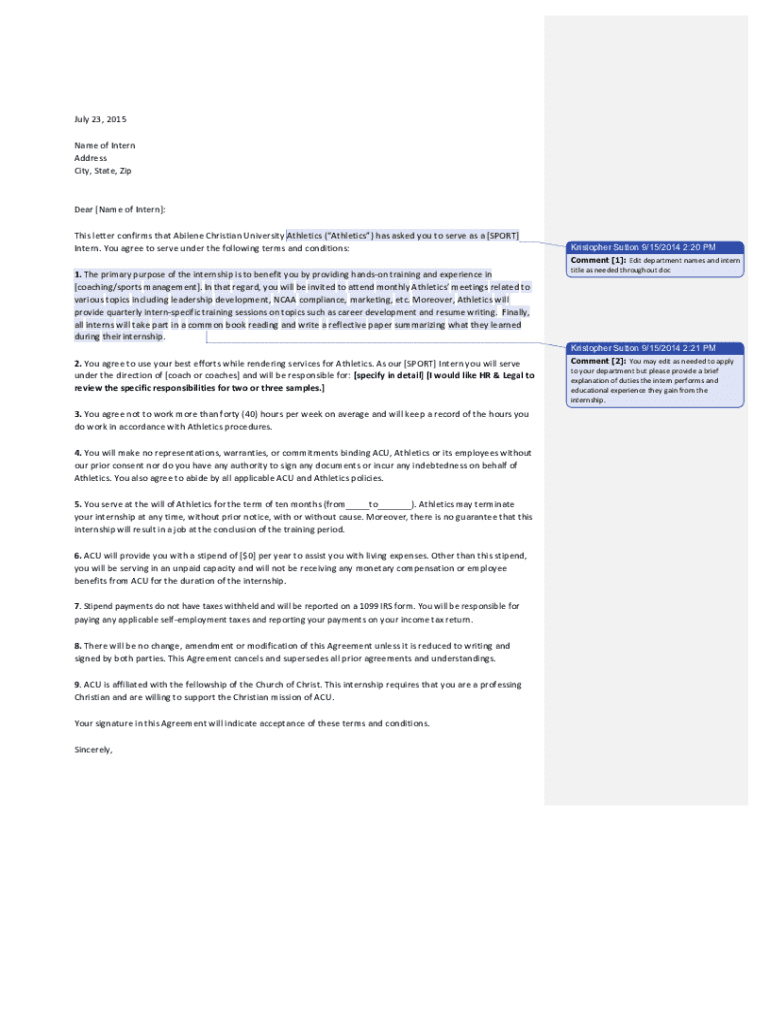 July23,2015 NameofIntern Address City, State, Zip Dear[NameofIntern]:ThisletterconfirmsthatAbileneChristianUniversityAthletics(Athletics)hasaskedyoutoserveasa[SPORT] Intern. Youagreetoserveunderthefollowingtermsandconditions:
